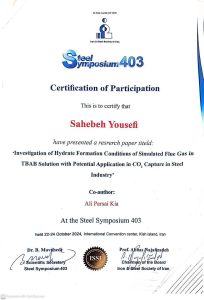 صاحبه یوسفی از کارشناسان مرکز نوآوری شرکت فولاد خوزستان در سمپوزیوم ۱۴۰۳ کیش به ارائه یک مقاله حضوری پرداخت. این مقاله که توسط صاحبه یوسفی و علی پارساییکیا تألیف شده، به بررسی شرایط تشکیل هیدرات گاز دودکش در محلول TBAB با هدف جذب CO₂ در صنعت فولاد میپردازد.